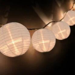 PaperLanternStore hand-crafts our own Paper Lanterns, so we can assure you our products are of the best quality. We offer over 100 different combinations of colors and styles with White being the most popular. These outdoor string lights include Shatterproof LED G40 clear light bulbs and is expandable by adding up to 9 more string lights (GY10W24). Plug them into a wall socket and they can be hung on tents, trees, poles, posts or any elevated surface in or around your home. Paper Lanterns can be matched to Holiday or Table Decor. We also provide Custom Printed and Personalized Paper Lanterns.