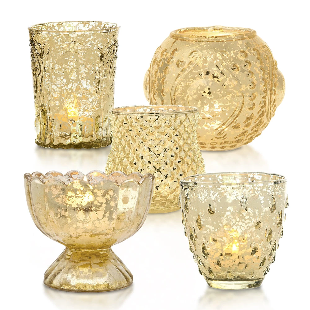 Composed of 5 unique shapes & sizes of mercury glass tealight candle holders, this set is the most practical gift for loved ones & yourself! Each votive candle holder comes with an antiqued metallic finish, perfect for adding a touch of elegance to any table setting, home decor, dinner party, holiday decorating (Christmas & Halloween), weddings, or special occasions