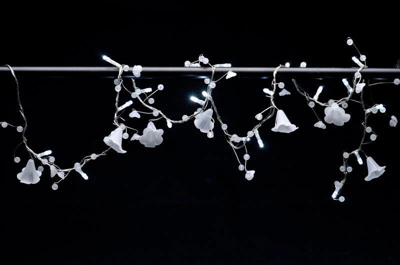 This battery operated LED garland light is beautiful, silver wire garland wrapped with 20 white LED lights. This garland has plastic flowers and beads accented with white LED lights. This LED garland light is ready to be put around any tree branch, vase, poles, and more. Battery pack can be easily tucked away from view.