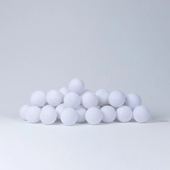 Our unique and stylish White color Cotton Ball string lights looks like a wound ball and consist of (10) 2.5 Inch woven fabric lights attached to a clear, battery powered string light. Like our paper lanterns, the warm glow from the energy efficient LEDs shining through the spun string adds to the elegant, beautiful atmosphere your bedroom room desires. With it being battery powered, portable and very light, feel secure in hanging this decoration anywhere around the house, outside on the patio during the summer months or at events like Wedding receptions, holiday parties, and other celebrations.