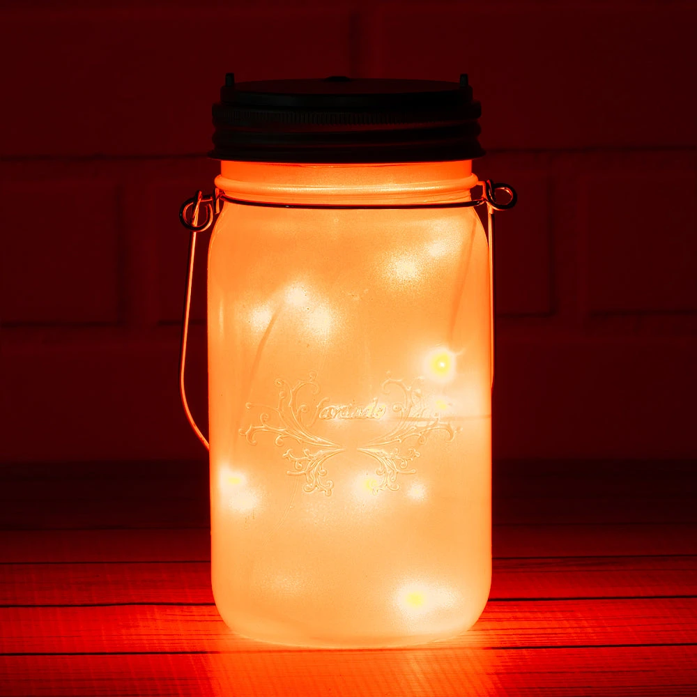 This Batter Powered LED Mason Jar Light in orange can be used with any wide mouth mason jar. Includes 20 LEDs which are attached to a thin copper wire, wires are attached to a built in battery unit affixed to the lid.