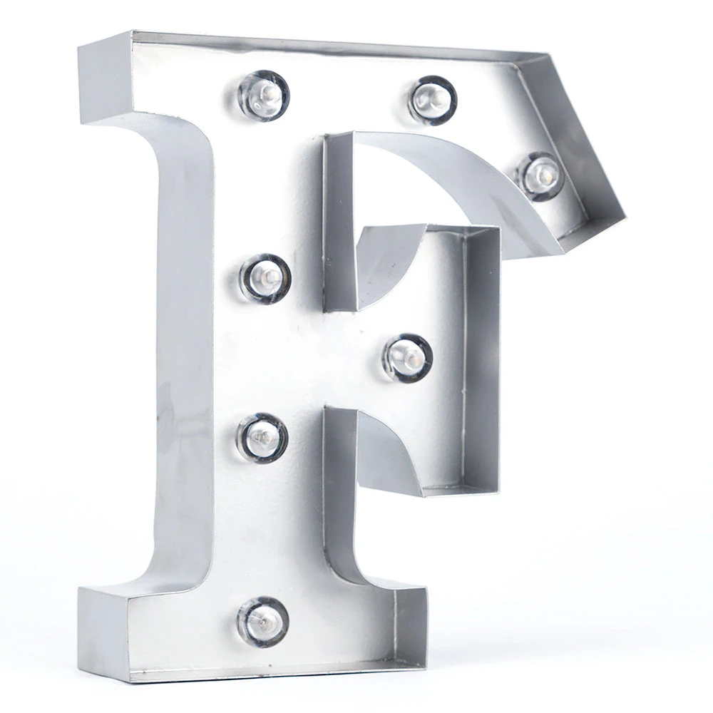 These ‘F’ vintage style marquee lights are professionally made and are extremely popular as Vintage 3D room decoration and event signage. Each battery powered letter or number is made of heavy, solid metal and can be hung (has keyhole slot in back for easy hanging) on walls, mantels or placed on top of a reception table during your event or celebration. Newlyweds for example, will highlight their union by combining first initials ‘A’ and ‘T’ with ‘&” to create a whimsy showpiece on the cake or candy table during their Wedding. Our illuminated marquee lights are highly versatile and portable as they measure just 8 inches tall, 2 inches thick, and will take 2x AA batteries so they are not too oversized and will not need to be plugged into an electrical outlet.