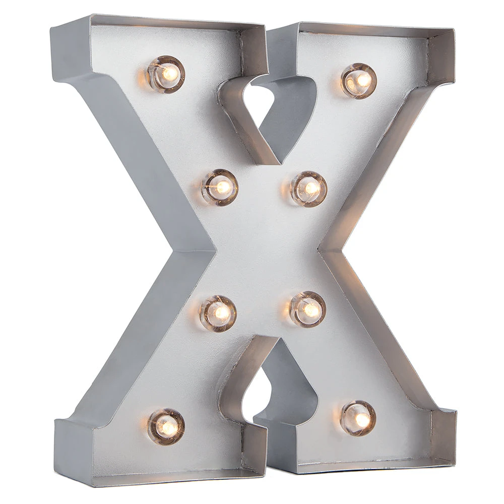 These ‘X’ vintage style marquee lights are professionally made and are extremely popular as Vintage 3D room decoration and event signage. Each battery powered letter or number is made of heavy, solid metal and can be hung (has keyhole slot in back for easy hanging) on walls, mantels or placed on top of a reception table during your event or celebration. Newlyweds for example, will highlight their union by combining first initials ‘A’ and ‘T’ with ‘&” to create a whimsy showpiece on the cake or candy table during their Wedding. Our illuminated marquee lights are highly versatile and portable as they measure just 8 inches tall, 2 inches thick, and will take 2x AA batteries so they are not too oversized and will not need to be plugged into an electrical outlet.