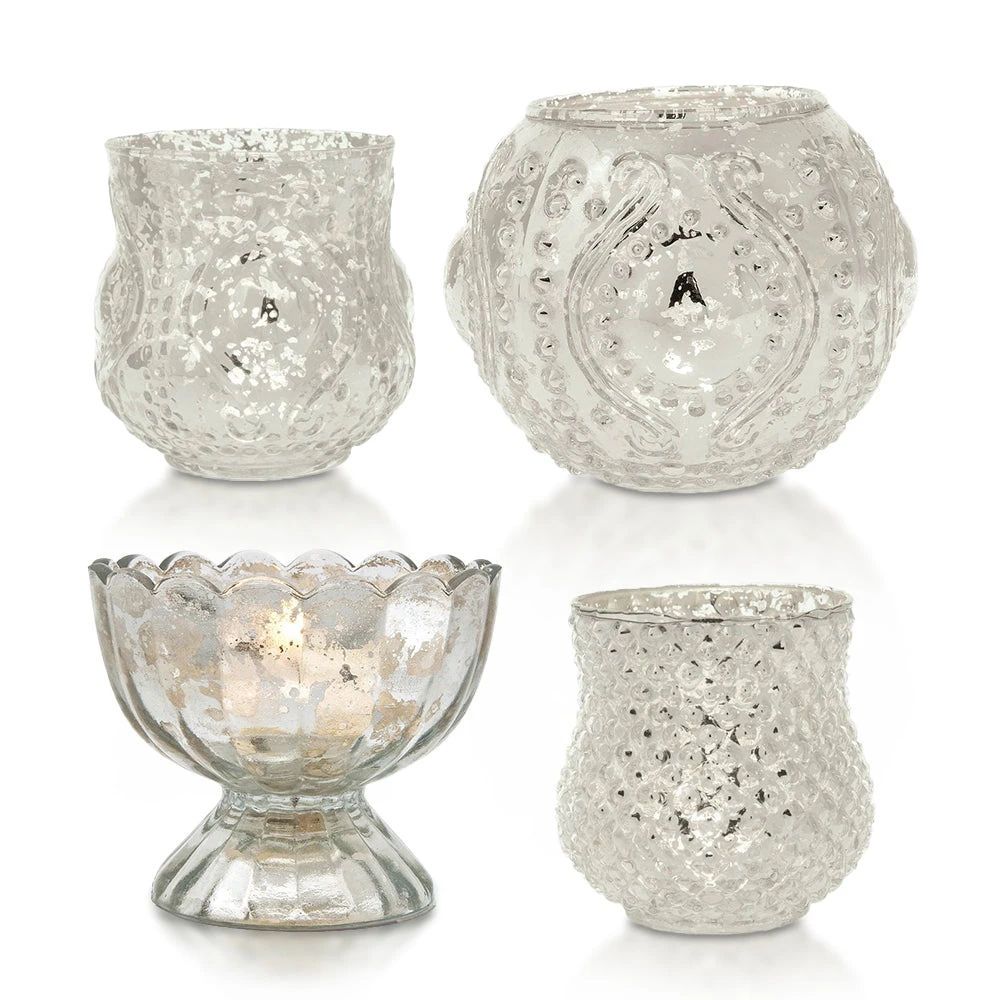 Composed of 4 unique shapes & sizes of mercury glass tealight candle holders, this set is the most practical gift for loved ones & yourself! Each votive candle holder comes with an antiqued metallic finish, perfect for adding a touch of elegance to any table setting, home decor, dinner party, holiday decorating (Christmas & Halloween), weddings, or special occasions