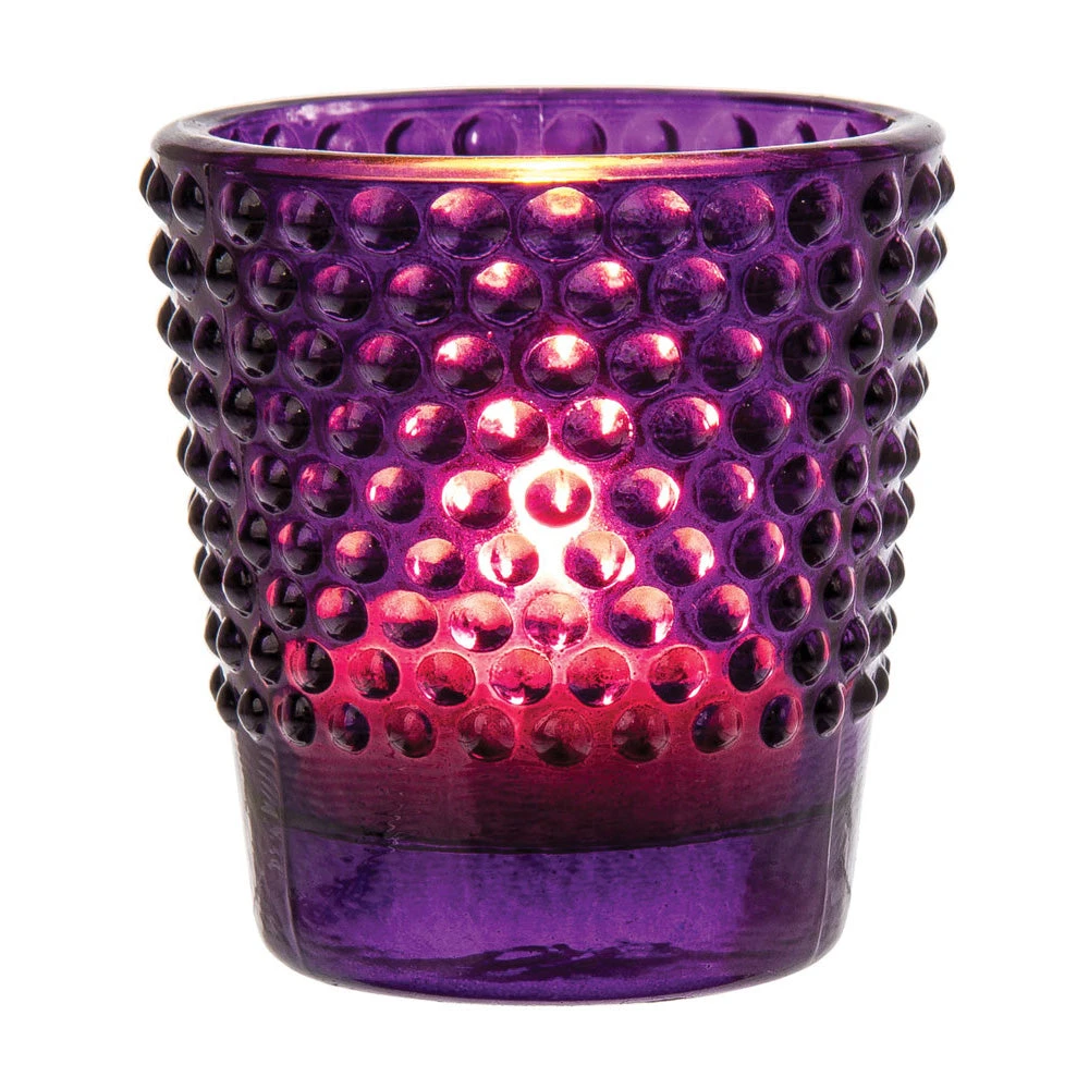These purple glass tea light holders are handpainted and beautiful colors. Featuring an attractive hobnail design, our glass candle holders capture candlelight and gives a beautiful display. Our candle holders are perfect for gifts, parties, weddings, and home decor. The can also be used for flowers! .
