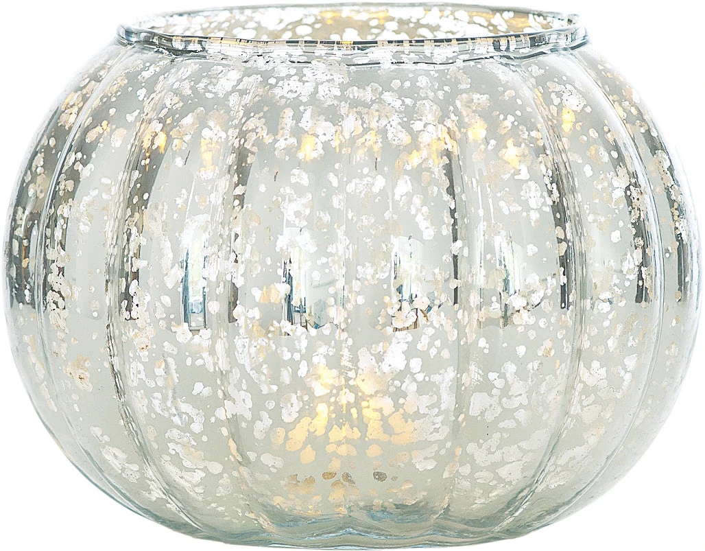 Our large round gold mercury glass candle holders have a pumpkin shaped design. They make great center pieces on your holiday or event tables.