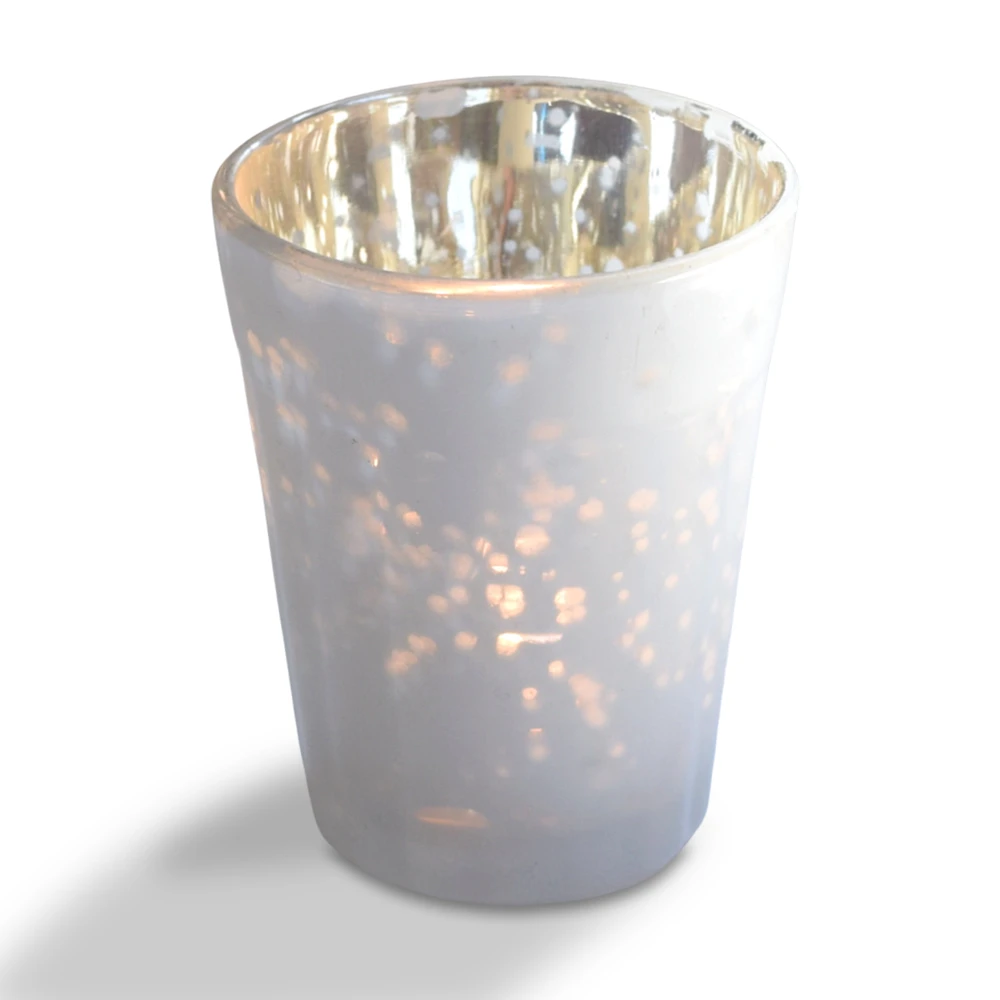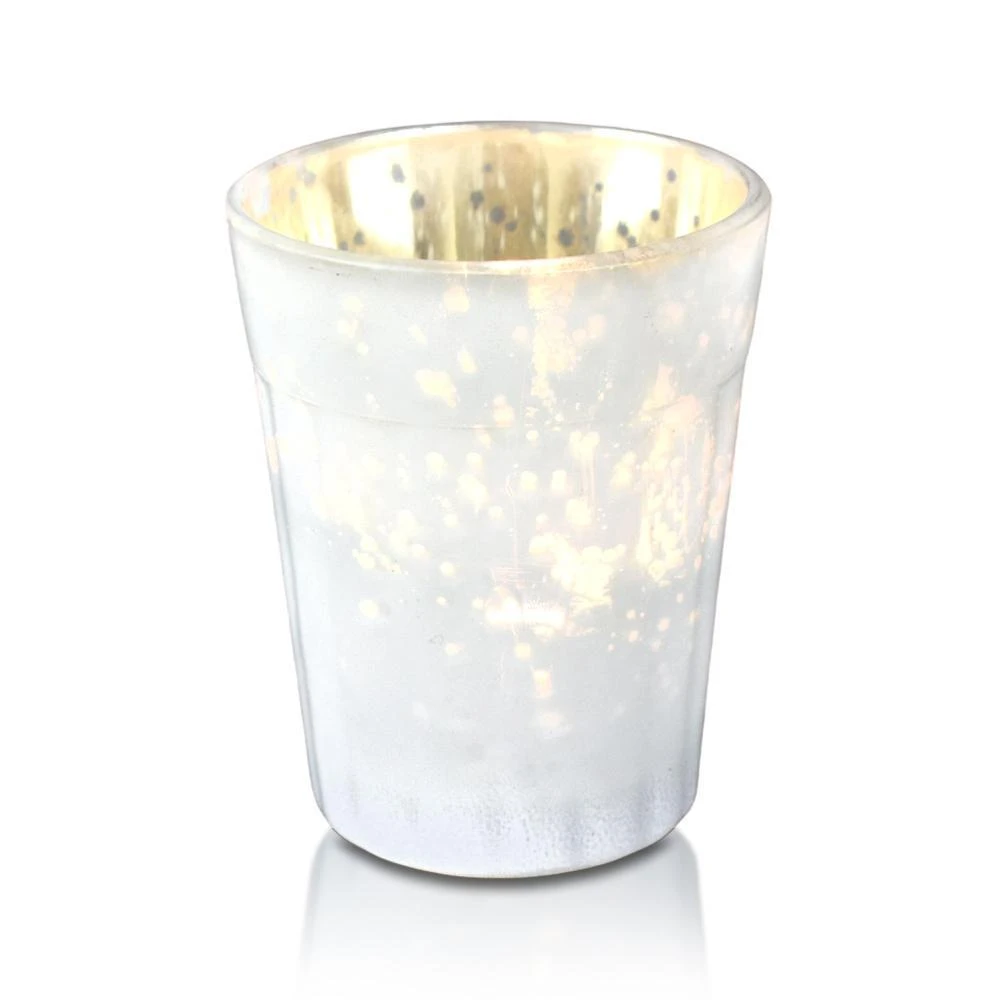 Pearl White Katelyn Mercury Glass Votive Candle Holder – Our columned mercury glass candle holder add dimension and shimmer to your holiday or wedding reception tables! Product Specifications Measurements: 2.5-inch diameter x 3.25-inches high. Food Use?: No Candle: For use with battery operated or real tea light *Please Note: As these are hand-crafted items, each piece may vary slightly in appearance from one another.