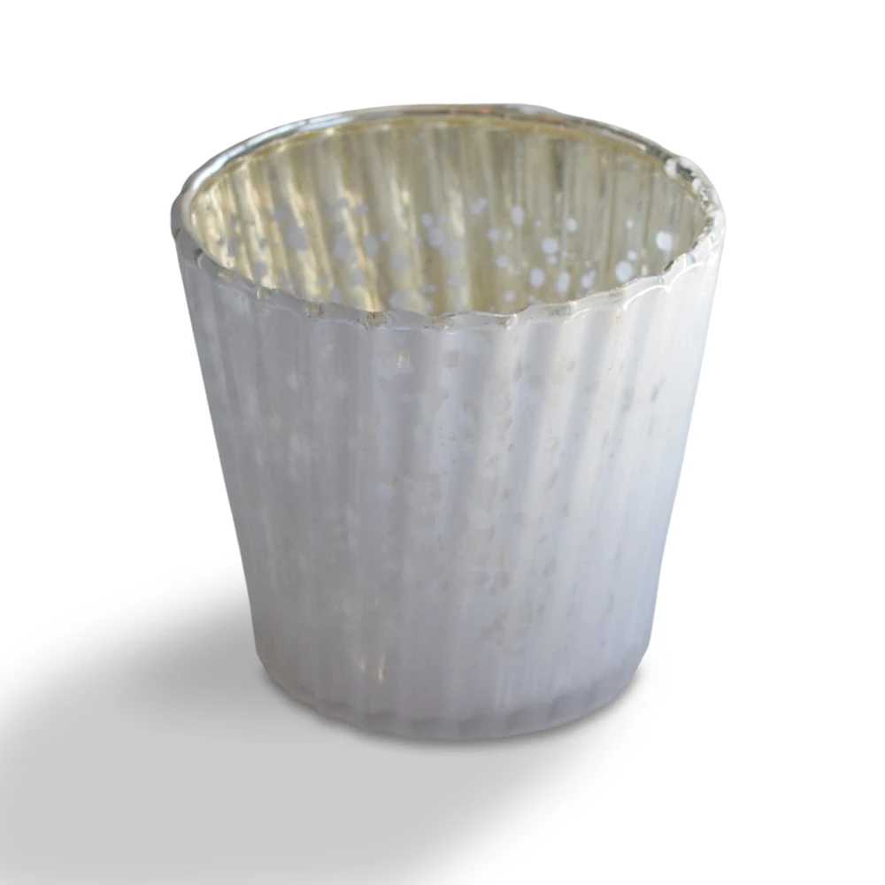 Pearl White Caroline Mercury Glass Candle Holder – Our small vertical lined mercury glass candle holder are the perfect addition to your holiday tables or as gifts for your wedding guests! Product Specifications Measurements: 3-inch diameter x 3-inches high. Food Use?: No Candle: For use with battery operated or real tea light *Please Note: As these are hand-crafted items, each piece may vary slightly in appearance from one another.
